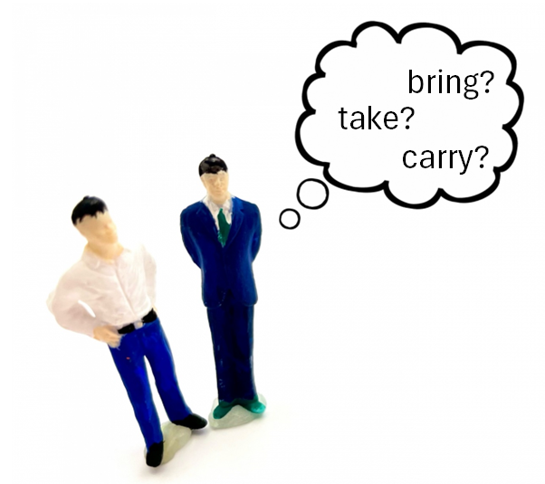 bring と take の使い分けは方向性を基準にすると覚えやすいです。話者や聞き手のいる場所に向かう場合は bring、離れた場所に運ぶ場合は take を使います。carry は物理的な運搬行為を表すため、どちらの方向にも使えます。