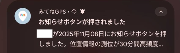 お知らせボタンとは、GPSを持っている方から管理者への緊急連絡が届くボタンです。我が家では子供に持たせていますが、迷子になった。変な人に声を掛けられた。待ち合わせ場所がわからなくなった。などの際に押すように言っています。