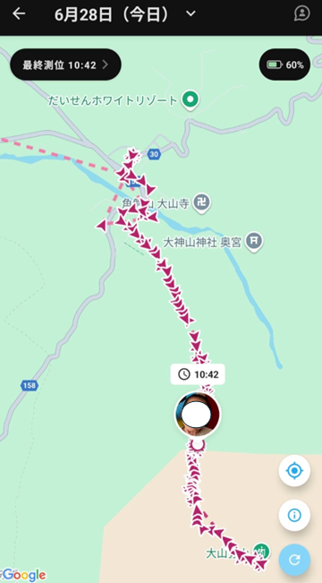鳥取県の大山を登山をした時の歩行履歴です。電波のない山頂まで、足取りがしっかり記憶されています。