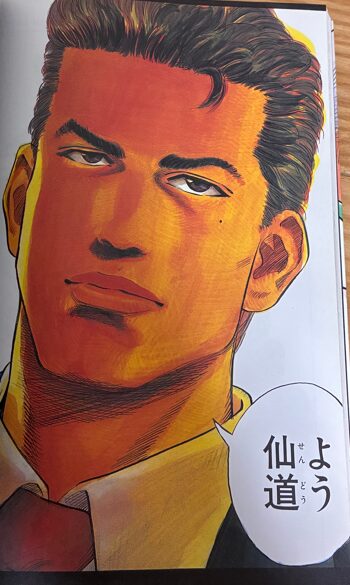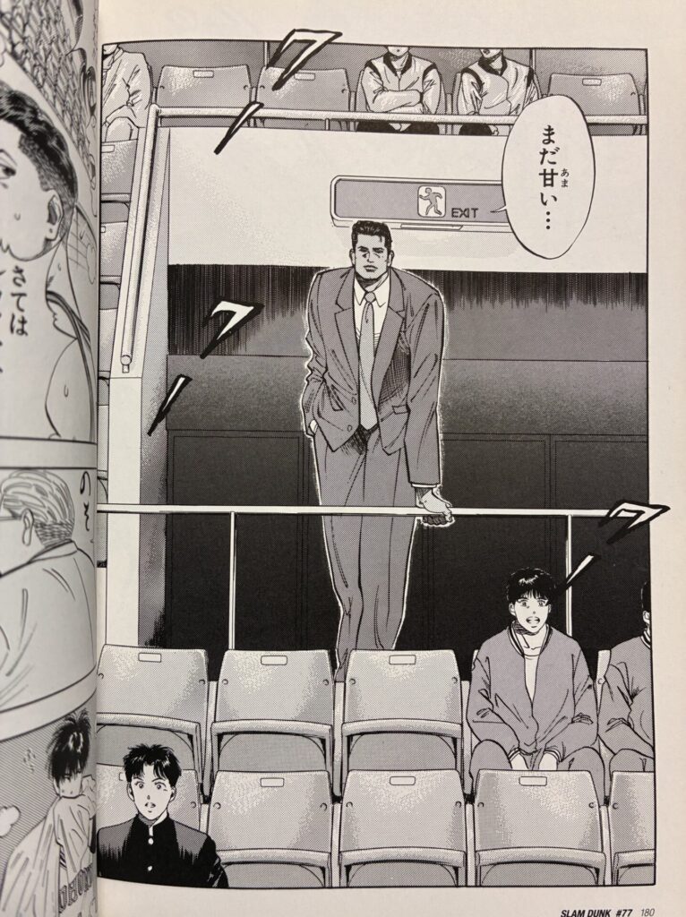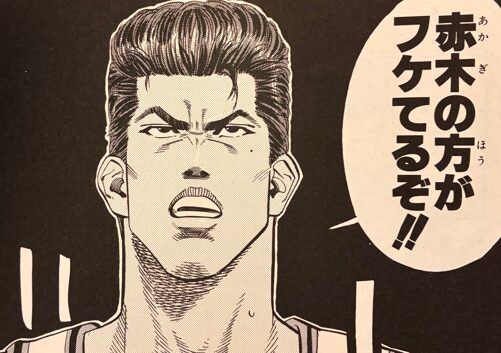 神奈川県No.1プレーヤー。そう、それが牧。初登場はどう見ても監督か、バスケットボール協会で教育的立場の人。いいですか。普通の高校生は前の席に座っているような男の子たちを指すんです。あなたはどう見ても社会人です。だれが高校バスケットの観戦にダブルスーツで来るのよww だいたい、初登場時に仙道が「牧さん」なんて呼ぶから監督だと思うやんww